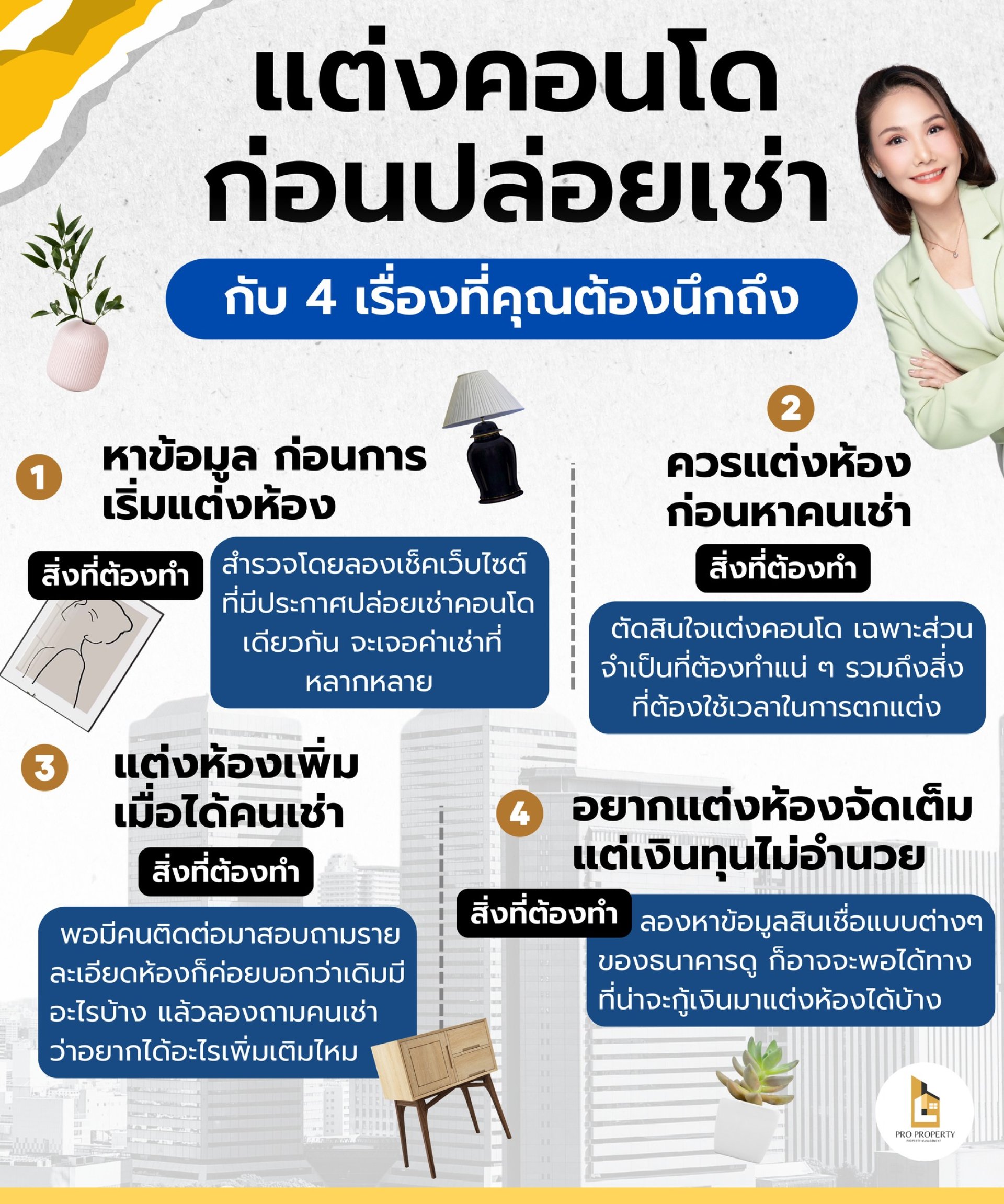 When I seriously decided to rent out my condo, the first thing I did was research rental prices. I checked websites listing condos in the same project and found a wide range of rental rates, depending on the options available, such as river views, city views, room size, and floor level. These were all included when I bought the unit. However, some features could be adjusted to increase the rent, such as air conditioning, water heaters, refrigerators, televisions, desks, and sofas.