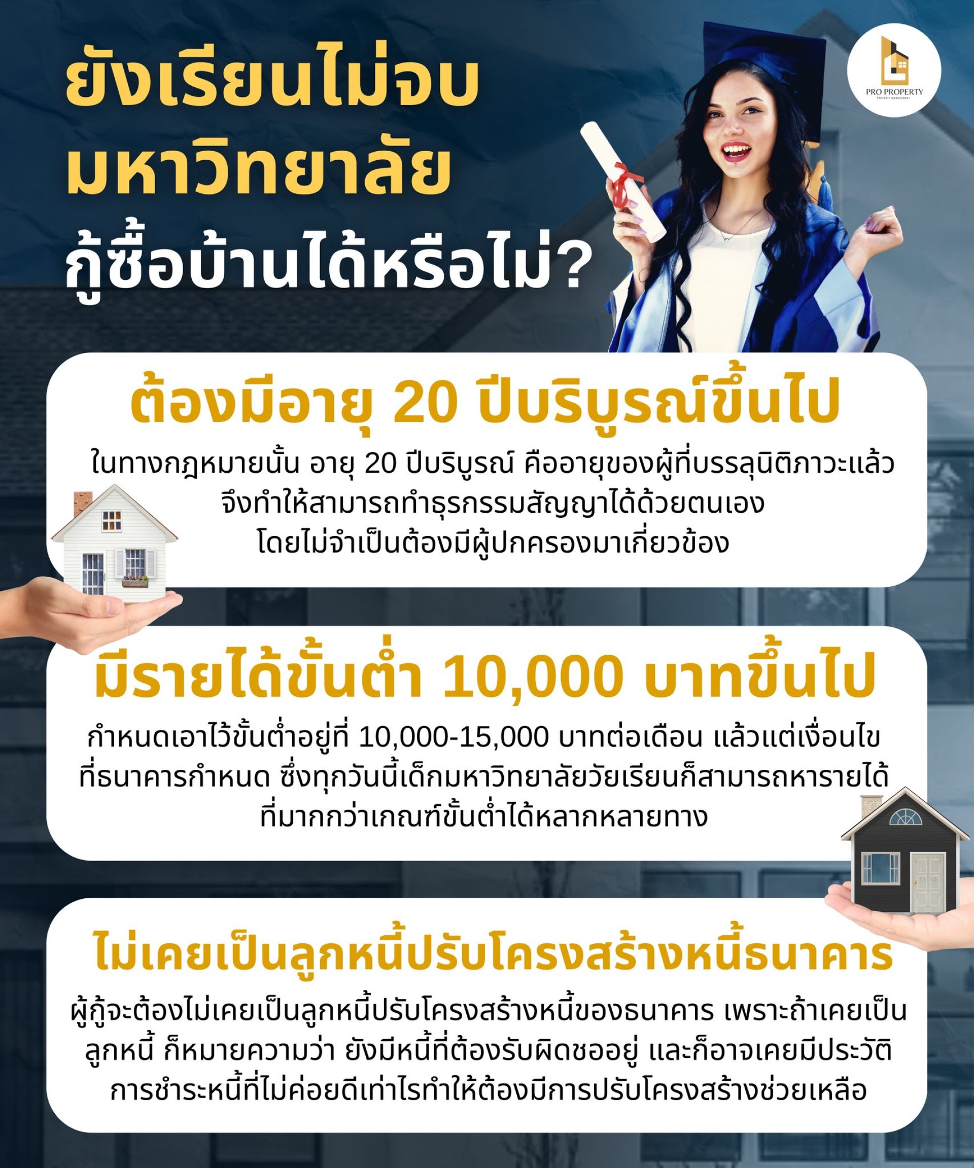 In short, even if you haven't graduated from university, you can apply for a house loan if you're over 20 years old, have a steady income of over 10,000 baht, and have never been in debt restructuring. Whether you'll be approved for a house loan depends on your income and whether the price of the house or condo you're buying is too high for your ability to repay. To increase your chances of getting approved for a house loan, you can apply jointly with your parents or siblings who also meet the same qualifications. This will greatly increase your chances of getting approved for a house loan.